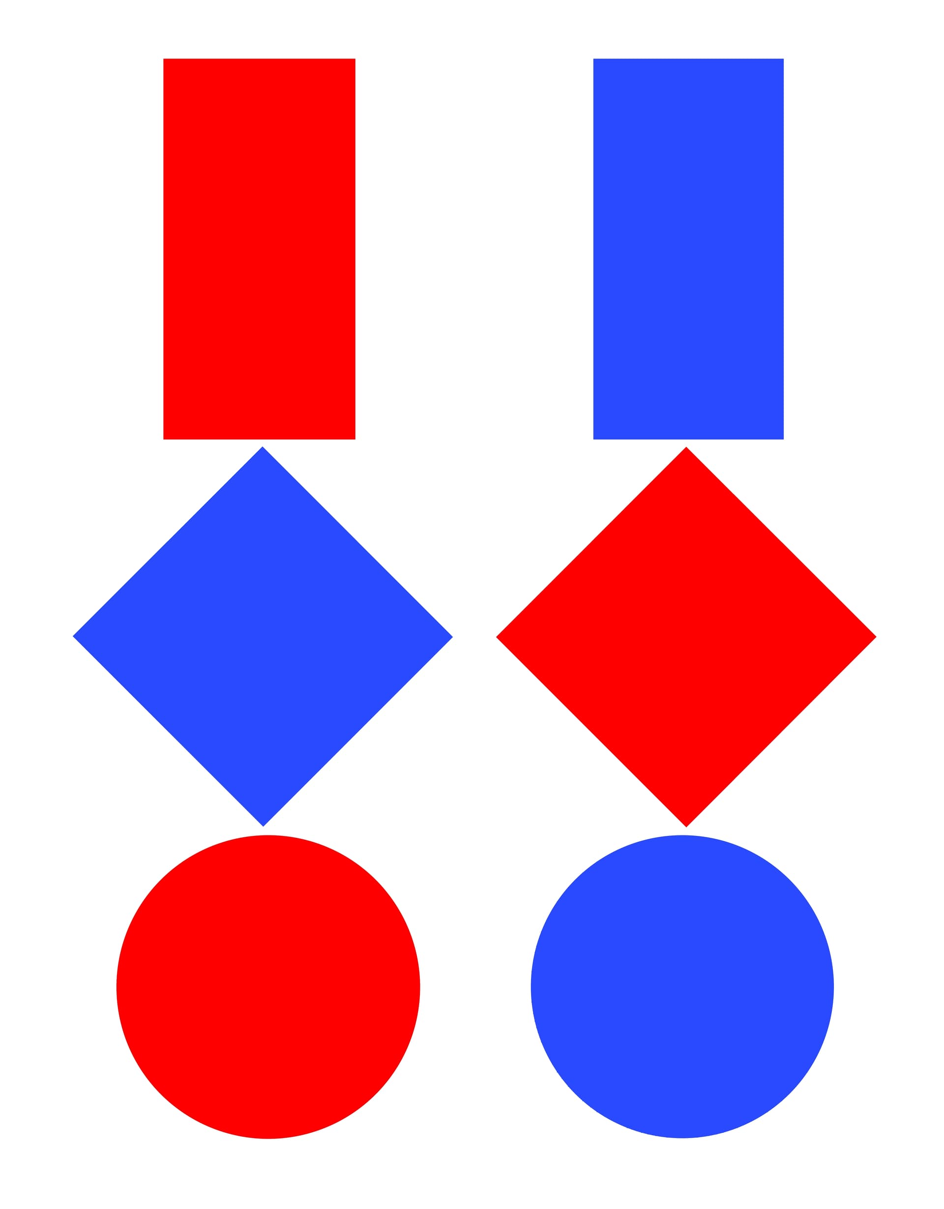 Get some red and blue cardboard or similar flat material. The colours should be more or less pure red and pure blue and should be of similar luminosity (so none of them is too dominant). You will need to cut three geometrical shapes of each colour: a round one, a square one and a rectangular one with the proportions 1:2.